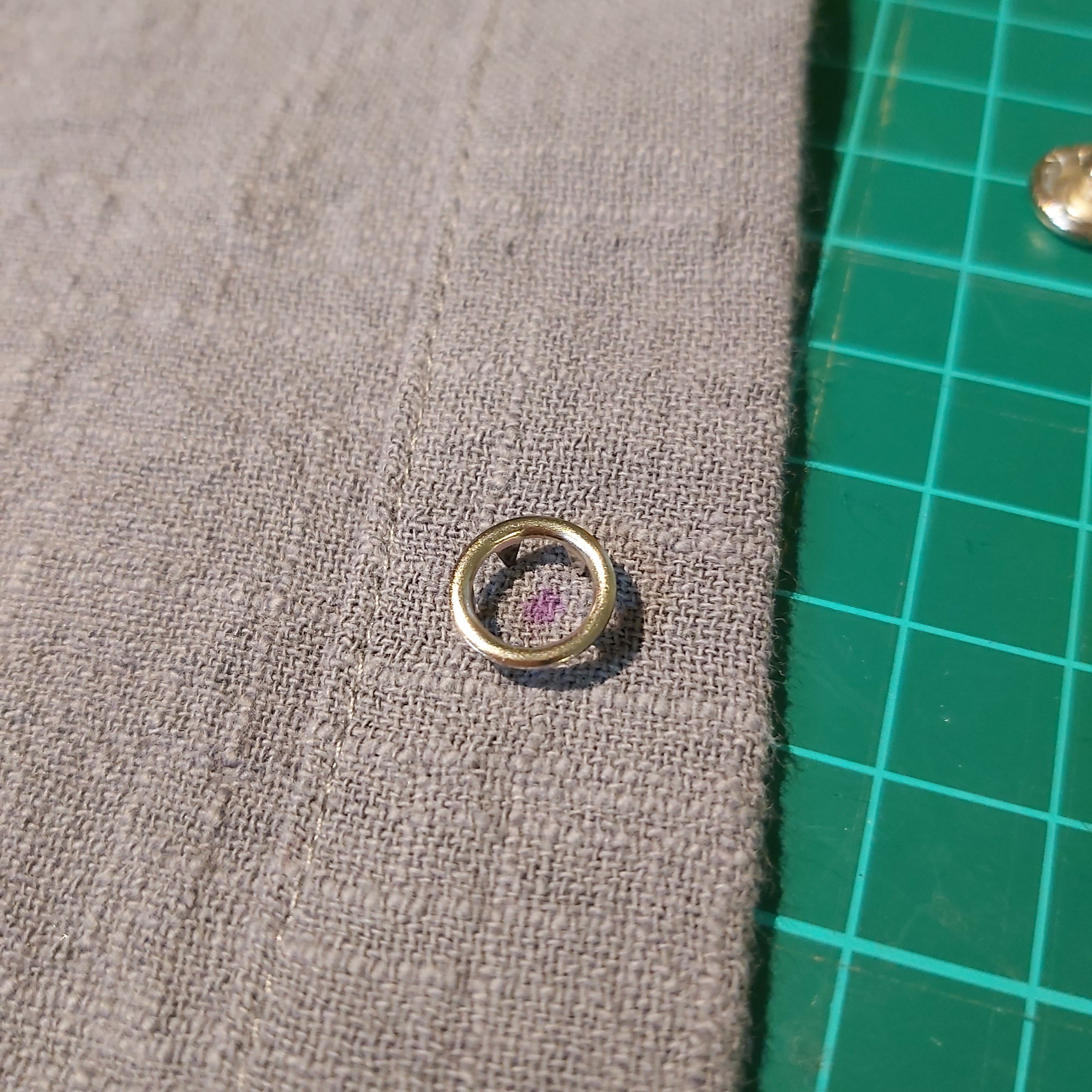 Pierce spikes of the ring (D) from the wrong side of the left placket .
